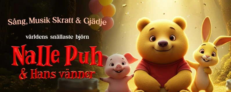 Följ med till Sjumilaskogen och upplev en av de mest älskade berättelserna någonsin – nu som färgsprakande barnmusikal! Under 2026 åker Nalle Puh och hans vänner på turné över hela Sverige, och du är inbjuden till en föreställning där fantasi, vänskap och äventyr får blomma.