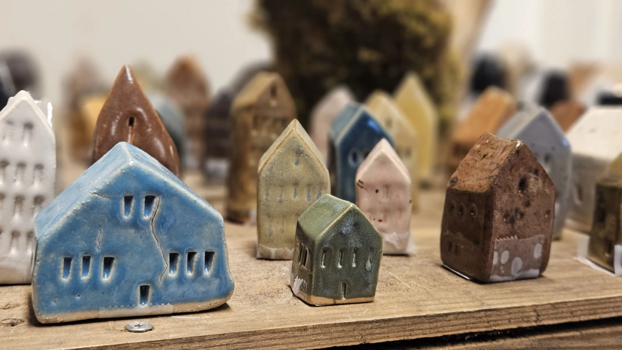 Miniatyrhus i keramik tillverkade av Pjäsgatans Kreativa samt konst med hem som tema på väggarna av Birgitta Ekholm, Kerstin Palmkvist och fotograf Håkan Karlsson.
